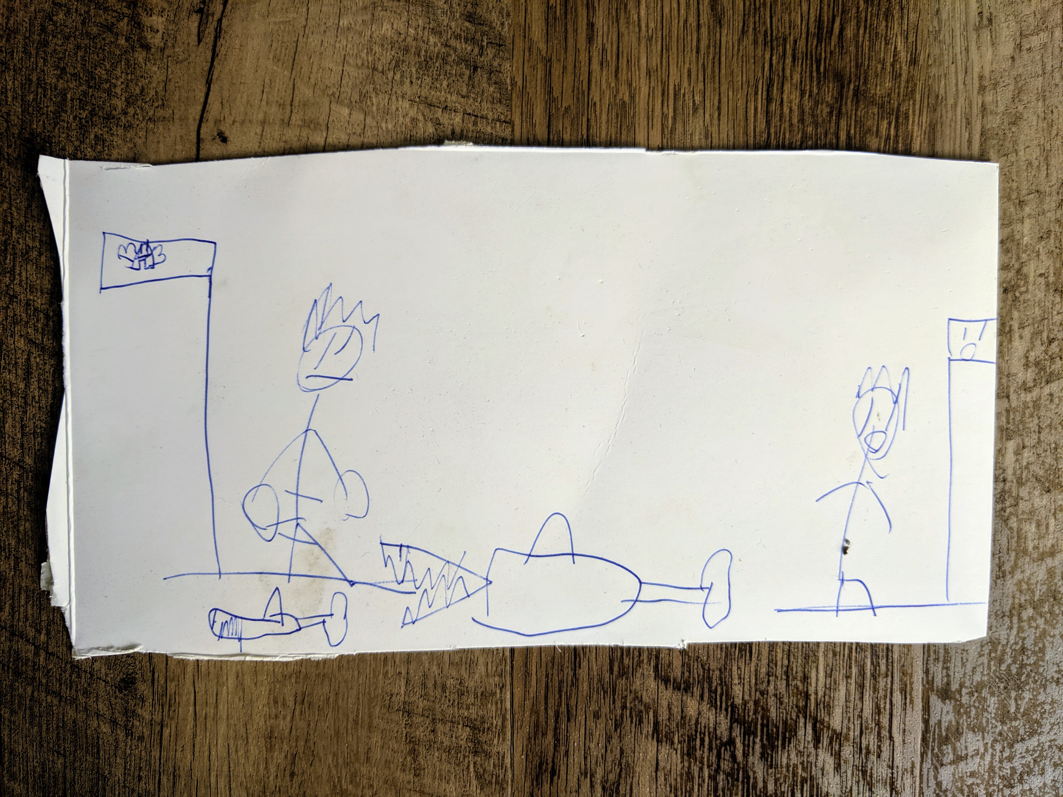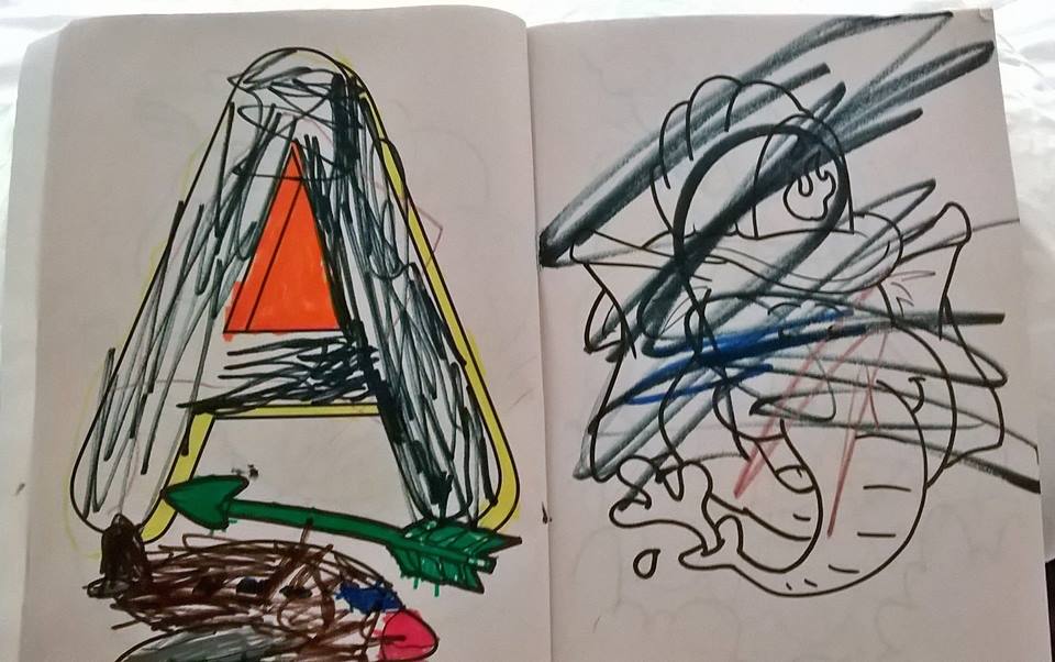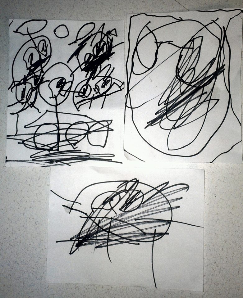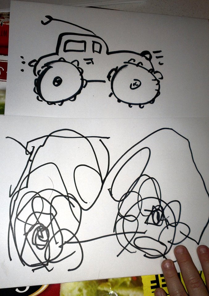 | Action drawings December 7, 2014 Looking at a child’s scribbles is sometimes like looking at a 2-dimensional snapshot of a 4th-dimensional scene recorded over a span of time. In many cases, you aren’t seeing a static image but an entire story, from start to finish, in one frame. Gives you a different perspective on a child’s drawings if you think of it this way. I was witness to the birth of these as the artist narrated what was going on… The upper left-corner image is his family members going for a walk and then going into the family race car for a drive (every family has a family race car, right?) The upper right corner image is a motorcycle going around a race track with increasing speed. The bottom image is a man who is being chased by lava and isn’t very happy about it because it eventually catches up to him and gets him. | Thumbnail![]() |