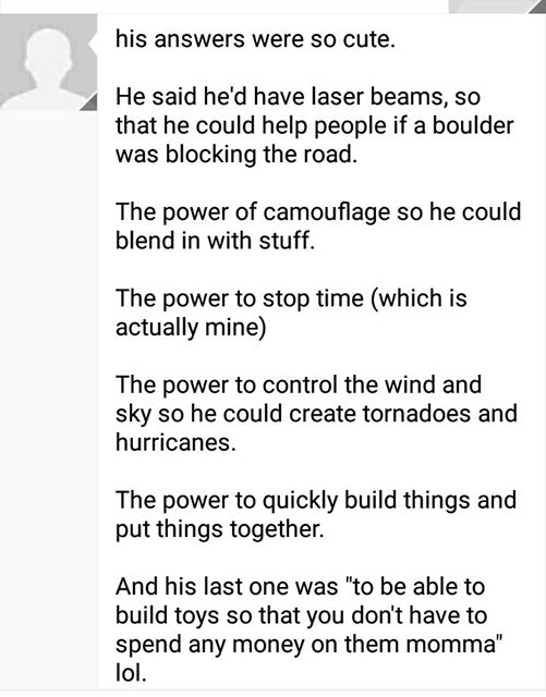 | Supertramp March 20, 2021 The grandboy is reading the instructions on a trampoline. Grandboy: Hey it says children should be using this with supervision. So I need an adult with me. Me: You wouldn’t need one if you were Superboy. Grandboy: Huh? Why is that? Me: Because he already has super vision. Grandboy: AAAAAHHHHH ![]() | Thumbnail |